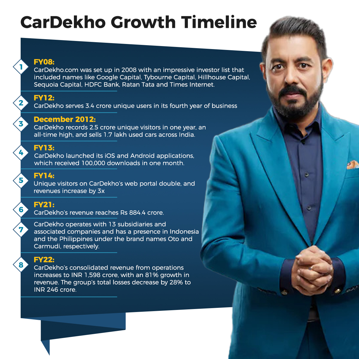 Cardekho founder & CEO Amit Jain, an alumnus of IIT Delhi, began his career at Tata Consultancy Services after completing his B Tech degree. After working for just over a year, Jain became the Product Manager at Trilogy, where he honed his skills before eventually co-founding GirnarSoft, where he now serves as CEO. Jain is also a shark on the new season of Shark Tank India, a popular show that features entrepreneurs seeking funding from successful businesspeople.