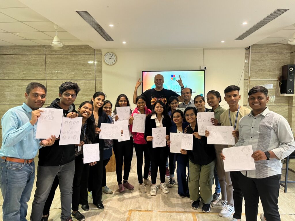 The institute recently hosted a special workshop on comic creation featuring Mr. Abhijeet Kini, the founder of Abhijeet Kini Studios. Mr. Kini, a Mumbai-based illustrator, animator, and independent comics publisher, is renowned for his comic series and intellectual properties such as “Angry Maushi,” “Bombay Rhymes,” and “Fanboys.” He has received accolades including the Best Illustrator Awards Bronze (2018 and 2019) at the Comic Con India Awards and the Animationxpress CBAM Awards (2021). With over two decades of experience, Mr. Kini has been a regular illustrator for Tinkle Comics since 2004 and also illustrates the Butterfingers book series for Penguin India.