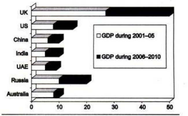 The following bar chart shows the GDP of different countries during the half decades 2001-05 and 2006-10. All figures are in $ billion.