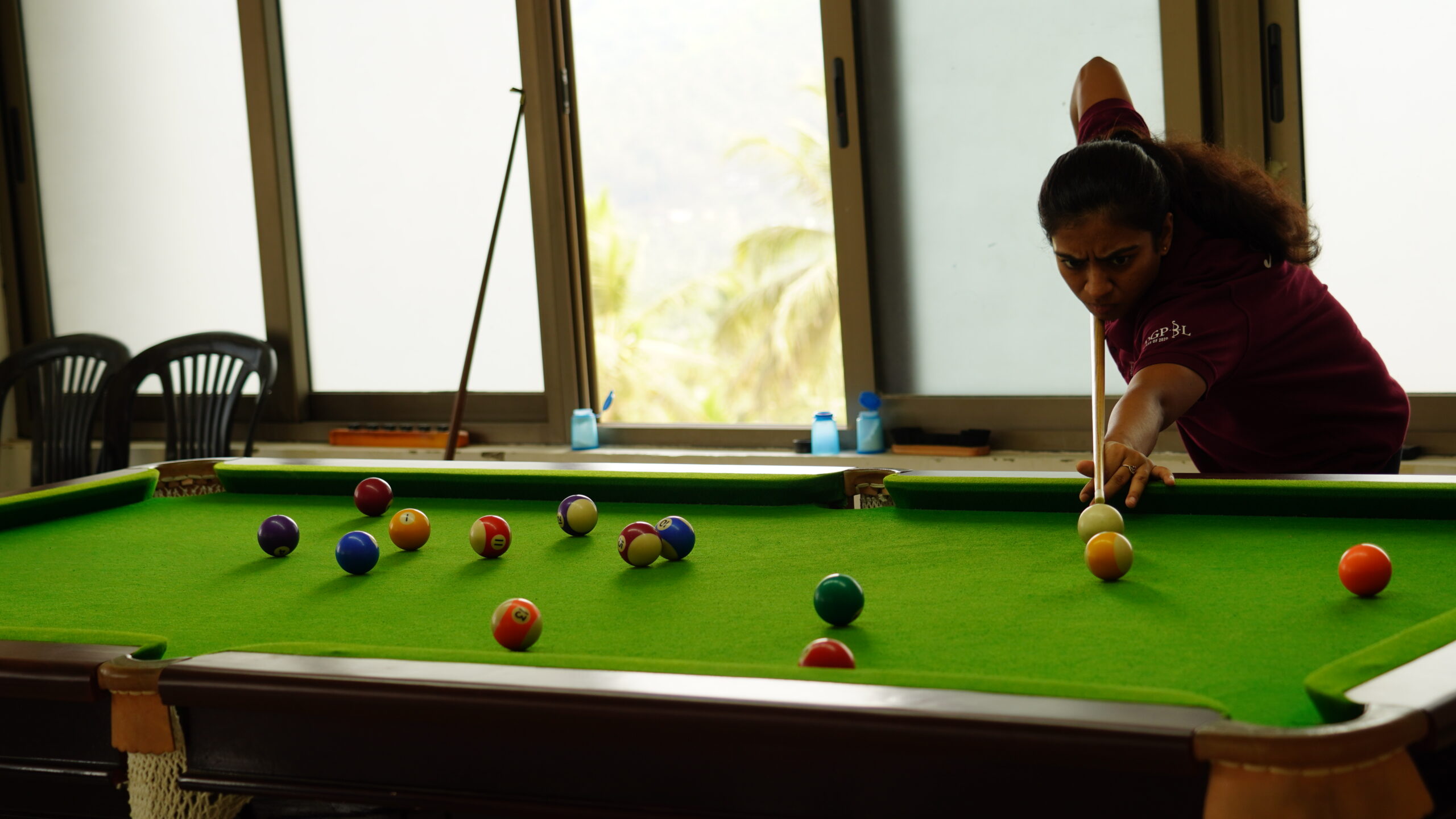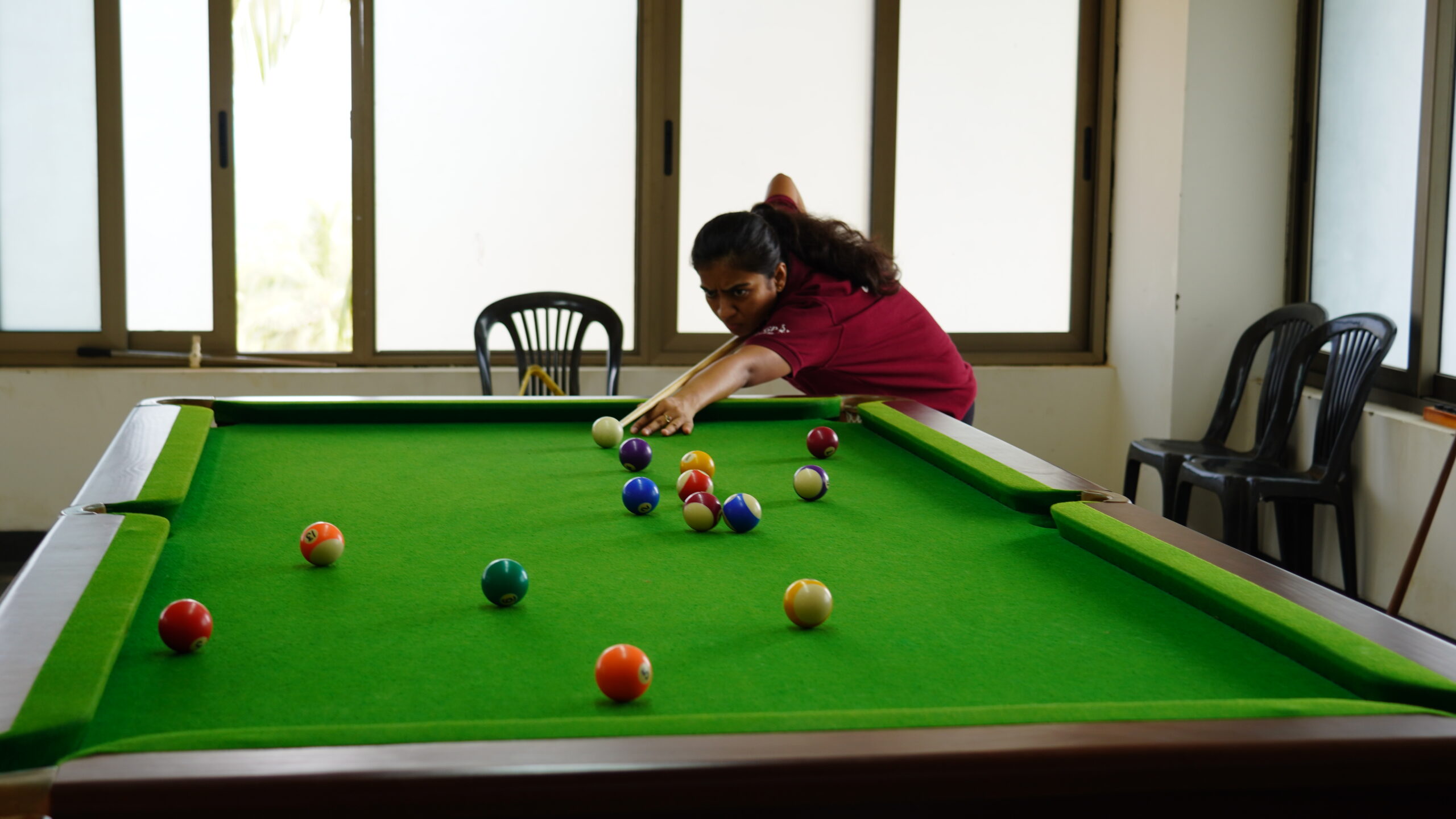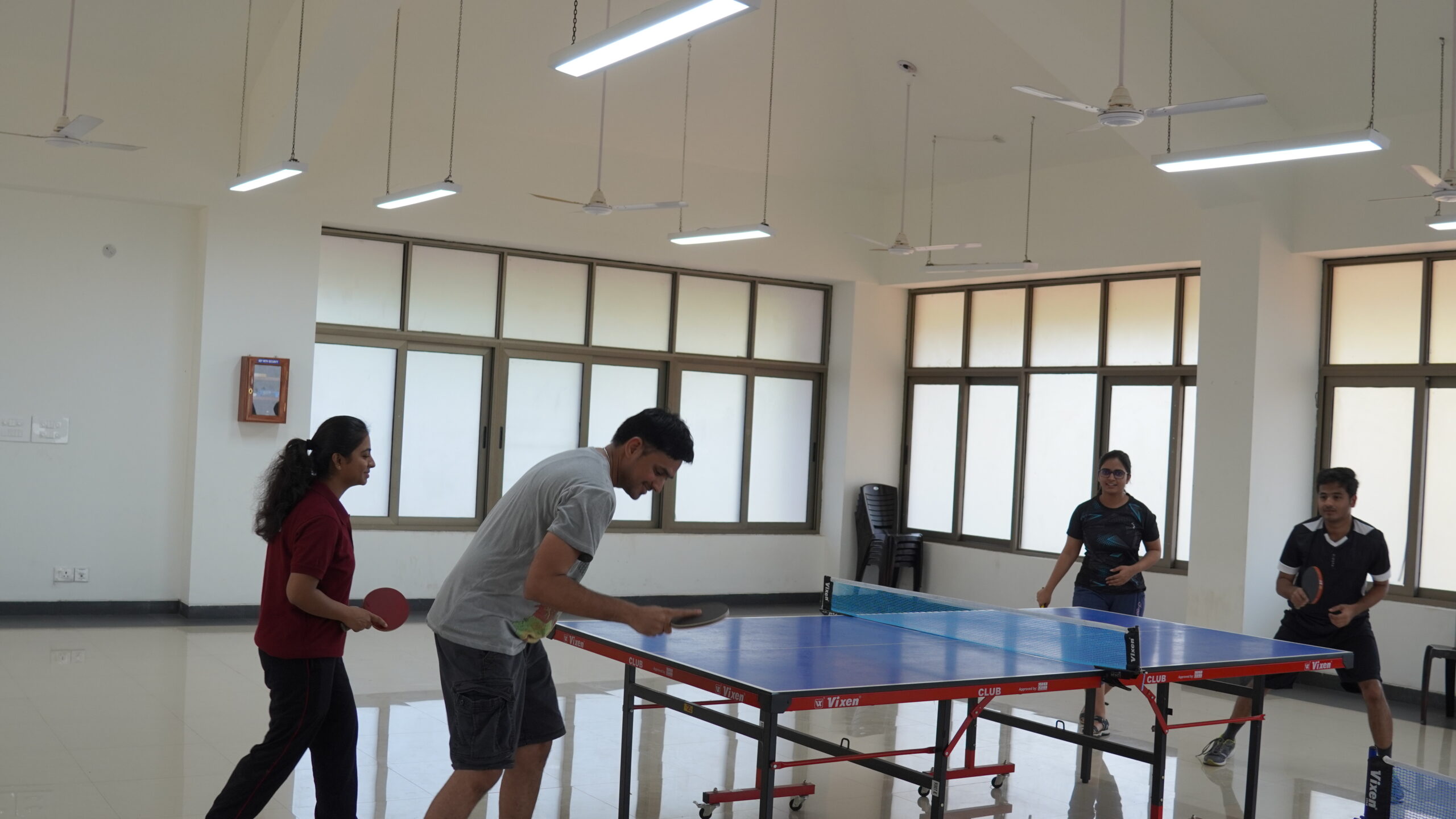 Indoor sports facilities for badminton, table tennis, carrom, pool, and chess.