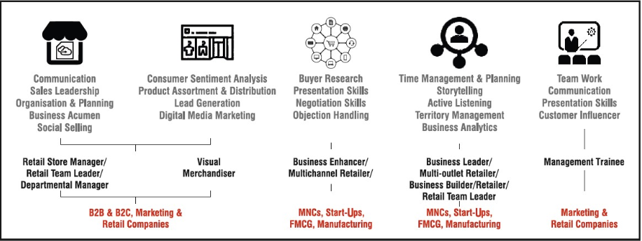 After completing an MBA in marketing, students have numerous career options available to them according to their field of interest. The program is well-designed with the objective to impart comprehensive knowledge, analytical & management skills along with real-time skill training for students. The team of experts has carefully mapped job roles to the curriculum on the lines of Sector Skills Council (SSC) and National Skill Qualification Framework (NSQF). Some of the job roles offered to our students after successful completion of training are Retail Team Leader, Visual Merchandiser, Business Enhancer, and Multichannel Retailer. Marketing management professionals are offered jobs in advertising agencies, marketing companies, retail organizations, FMCG & service sector organizations like Accenture, Amazon, Panasonic, Dabur, Asian Paints, ICICI, Federal Bank, AON, S&P Global, Jio, SG Analytics, Maruti Suzuki, HUL, Volvo Eicher, Citigroup, Deloitte, Facebook, TCS, HDFC Bank, ITC group, India Infoline, Hyundai, Airtel, McKinsey, Microsoft, etc. An MBA (Marketing) graduate gets trained in developing research orientation, super management skills, problem-solving attitude, business acumen, and goal-oriented behavior to work under pressure and perform in stiff competitive scenarios.