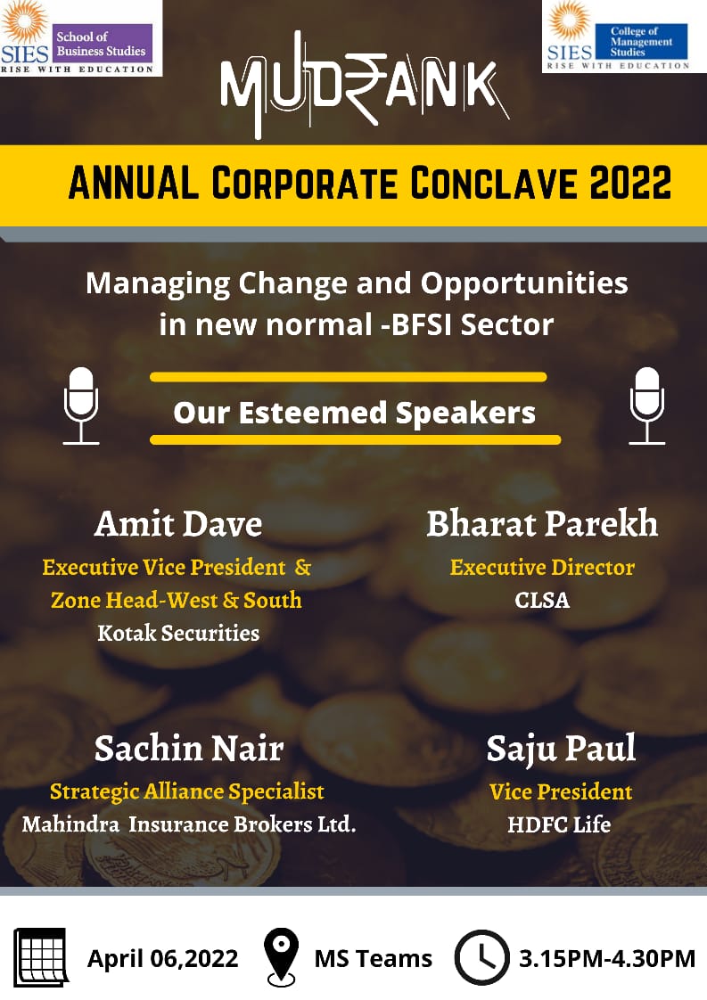 MUDRANK, a Finance Conclave & a part of Virtualities, is celebrated every year for the past 25 years. Each time SIES has done Mudrank, the Conclave was preceded by interesting and value-adding sessions. This year, Mudrank was celebrated on the 6th of April, 2022 on MS Teams. Students got a lot of valuable insights from the intellectual personalities and stalwarts from the field of Finance who were invited to share their knowledge and views with respect to the current trends, opportunities & challenges in the Finance sector. It was an enlightening session for all with the illustrious thoughts that were shared by the honorable guest speakers.