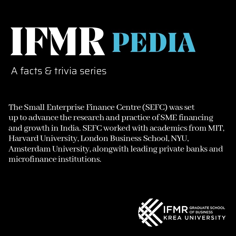 The Research Centres at IFMR have for decades worked at the intersection of research and action. In the mid-2000s, as the microfinance revolution evolved, SEFC set on a pursuit to create innovative ways to lend to small businesses, trying to make them bigger and better. In 2006, apart from full-time research associates, Prof Antoinette Schoar (Massachusetts Institute of Technology), Prof Viral Acharya (London Business School), Prof Mudit Kapor (Indian School of Business), Prof Raj Iyer (Amsterdam University), Prof Rema Hanna (New York University), Prof Gustova Manso (Massachusetts Institute of Technology), Manuel Adelino (PhD student, Massachusetts Institute of Technology) and Rock Magleby Lambert (PhD student, Boston University) were associated with the Centre in its research activities.