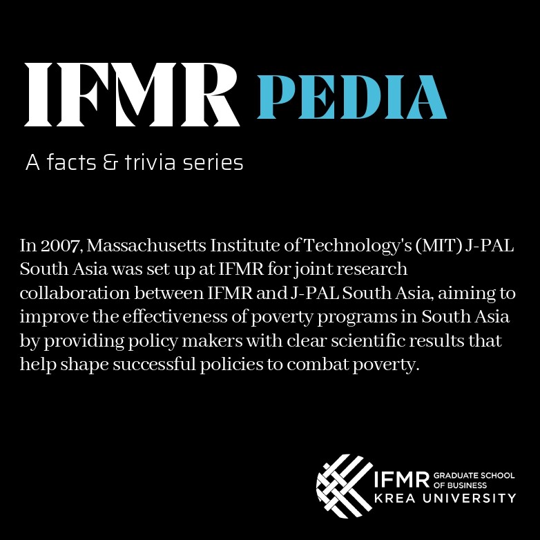In 2007, Massachusetts Institute of Technology’s (MIT) J-PAL South Asia was set up at IFMR for joint research collaboration. Much of Nobel Laureates Abhijit Banerjee and Esther Duflo’s work on randomized control trials for shaping policy in India was done at J-PAL South Asia.