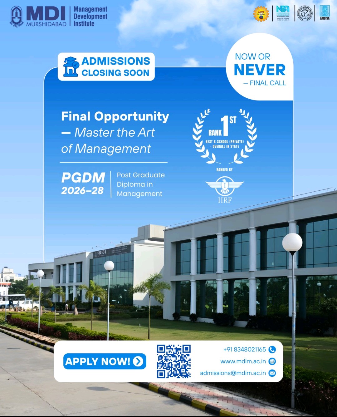 #MDIMurshidabad #PGDM2026_28 #AdmissionsOpen #FinalCall #ApplyNow #FutureLeaders #MBAJourney #ManagementExcellence #LeadershipStartsHere