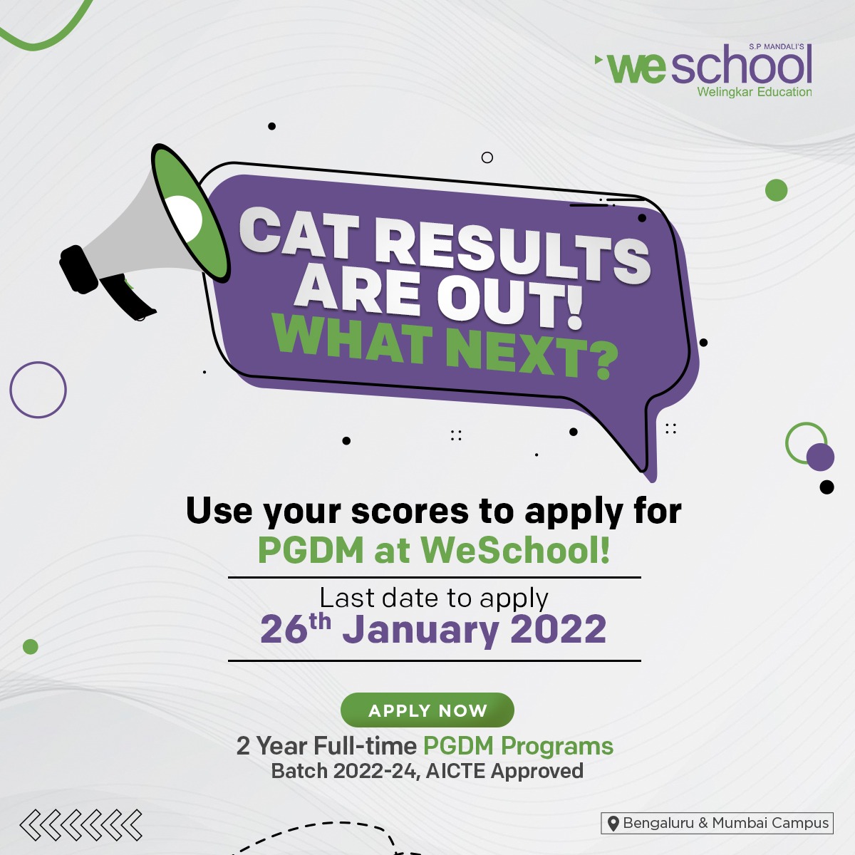 Hey, CAT2021 results are out!! What are you waiting for, apply now to Welingkar Institute with your CAT Score at https://pgdm2022-24.welingkar.org/weschool before 26th Jan 2022